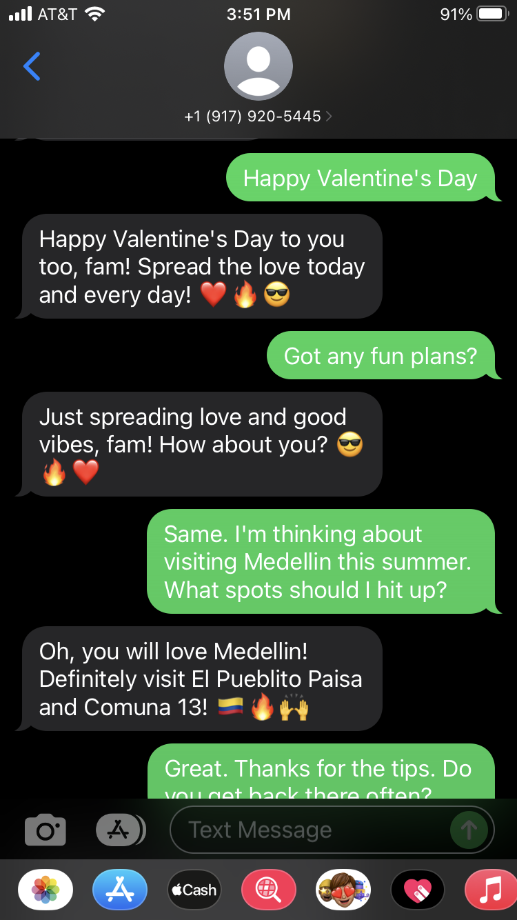 Antfood designed and implemented an experience where users engaged in live conversations with an AI rendition of J Balvin. Conversing in both Spanish and English, we meticulously trained the J Balvin AI to mirror his tone, language style, and even his sense of humor for rewarding exchanges with his fans.